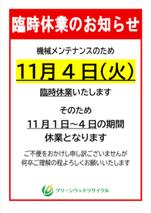 竹・篠類の受入中止についてのお知らせ 2025 3/26 新着情報 2025年3月26日 下記の通り、竹類の受入れを中止とさせて頂きます。 ご不便おかけしますが、ご了承下さいますようお願い申し上げます。 新着情報 🚙搬入受入時間変更のお知らせ🚛 🎏5月の営業日のお知らせ🎏 関連記事 🌟臨時休業についてのお知らせ 2025年10月24日 🍁11月の営業日についてのお知らせ🍁 2025年10月24日 🍠10月の営業日についてのお知らせ🍠 2025年9月24日 🔔お知らせ🔔 2025年9月17日 🌻9月の営業日についてのご案内🌻 2025年9月17日 🍆8月の営業日についてのお知らせ🍆 2025年7月30日 🍉7月の営業のお知らせ🍉 2025年7月1日 🐸6月の営業日についてのお知らせ☔ 2025年6月17日