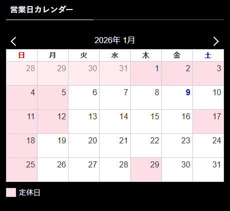 🐍1月の営業日についてのお知らせ🐎 2026 1/09 新着情報 2026年1月6日2026年1月9日 1月1日・2日・5日・12日・17日・29日・他ピンクの所が休業日となります。 ご不便おかけしますが、何卒ご了承下さいますようお願い申し上げます。 新着情報 🎍年末年始の休業日について🌅 🌟重要なお知らせ🌟 関連記事 🌟重要なお知らせ🌟 2026年1月9日 🎍年末年始の休業日について🌅 2025年12月12日 🌟重要なお知らせ🌟 2025年11月28日 ⛄12月の営業日についてのお知らせ⛄ 2025年11月28日 🌟臨時休業についてのお知らせ 2025年10月24日 🍁11月の営業日についてのお知らせ🍁 2025年10月24日 🍠10月の営業日についてのお知らせ🍠 2025年9月24日 🔔お知らせ🔔 2025年9月17日
