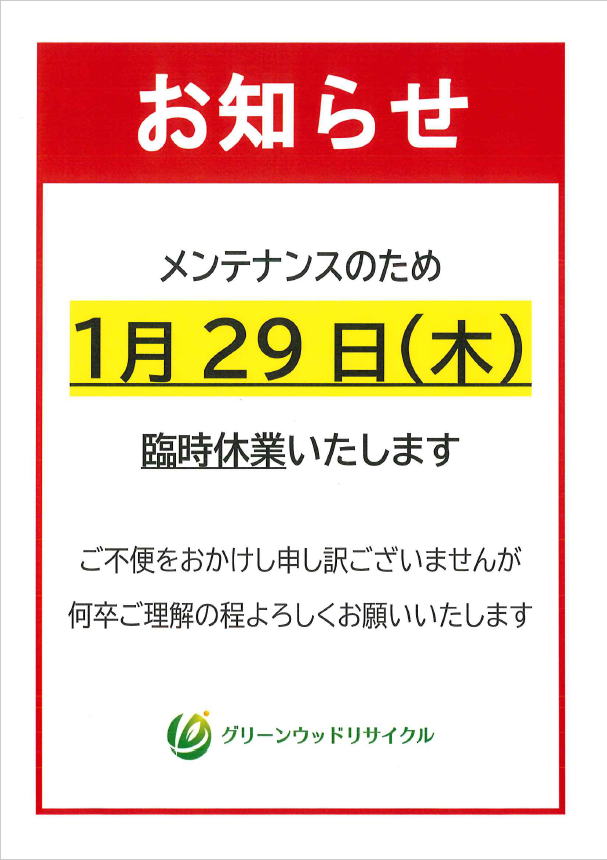 下記の通り、1/29メンテナンスのため臨時休業となります。